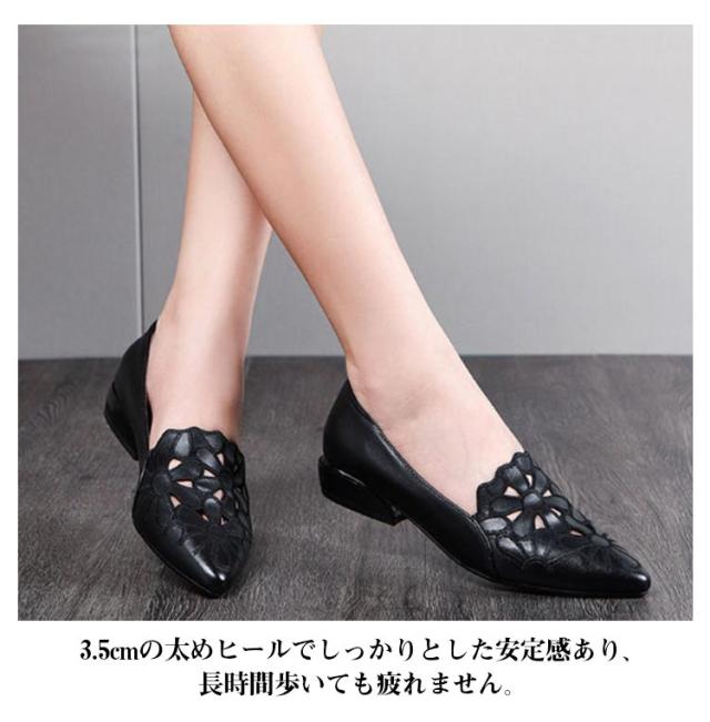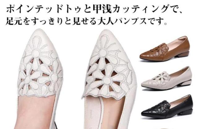 | ポインテッドトゥと甲浅カッティングで、足元をすっきりと見せる大人パンプスです。 フラワー模様の透けデザインは通気性に優れています。 尖りすぎず、丸過ぎない、程良いポインテッドトゥ。 上品ですっきりとした印象を与えます。 3.5cmの太めヒールでしっかりとした安定感あり、長時間歩いても疲れません。 普段履きからオフィスまで使えて、春夏に大活躍する一足。 | |