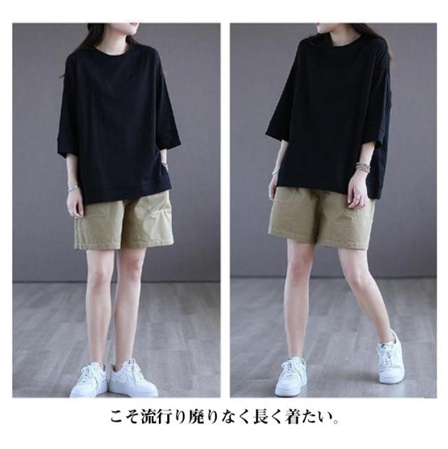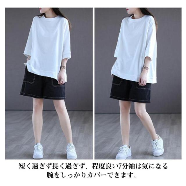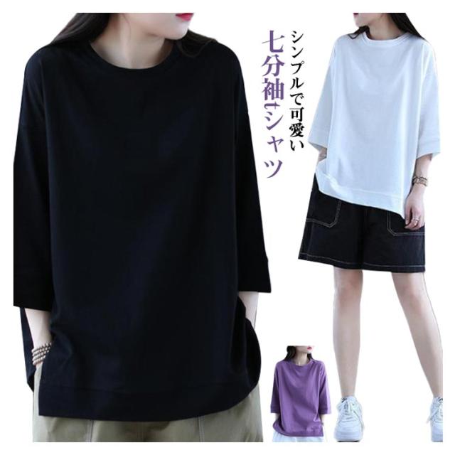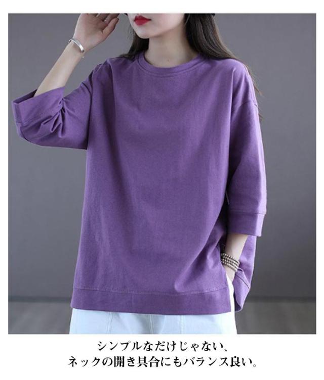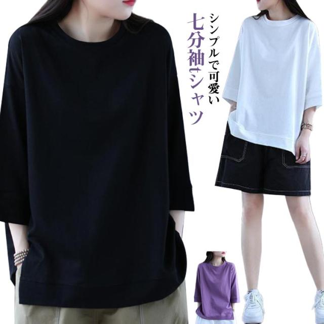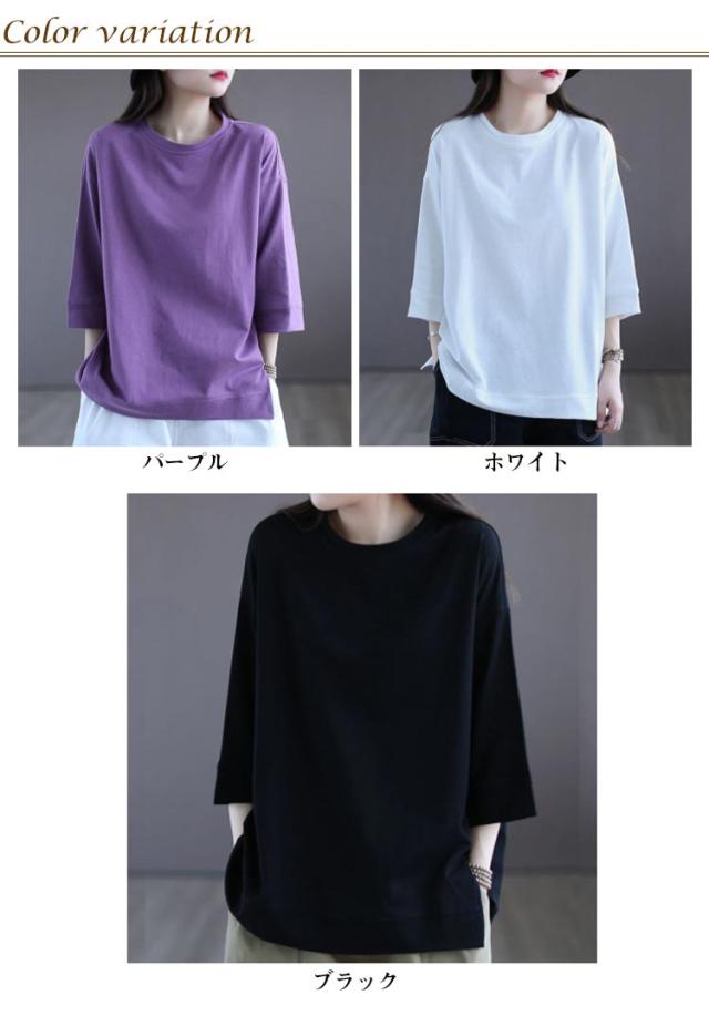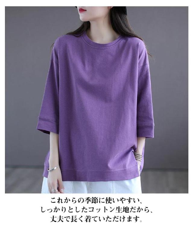 tシャツ 無地 レディーストップス 五分袖tシャツ ラウンドネック カットソー シンプル 七分袖tシャツ 5分袖 ゆったり ロングtシャツ プルオーバー 春夏 半袖 カジュアル パープル ホワイト ブラック