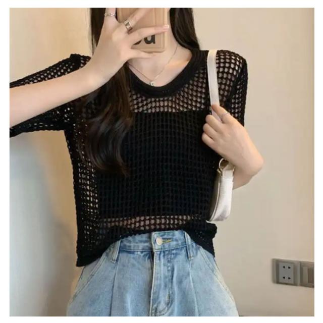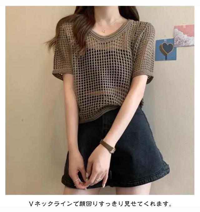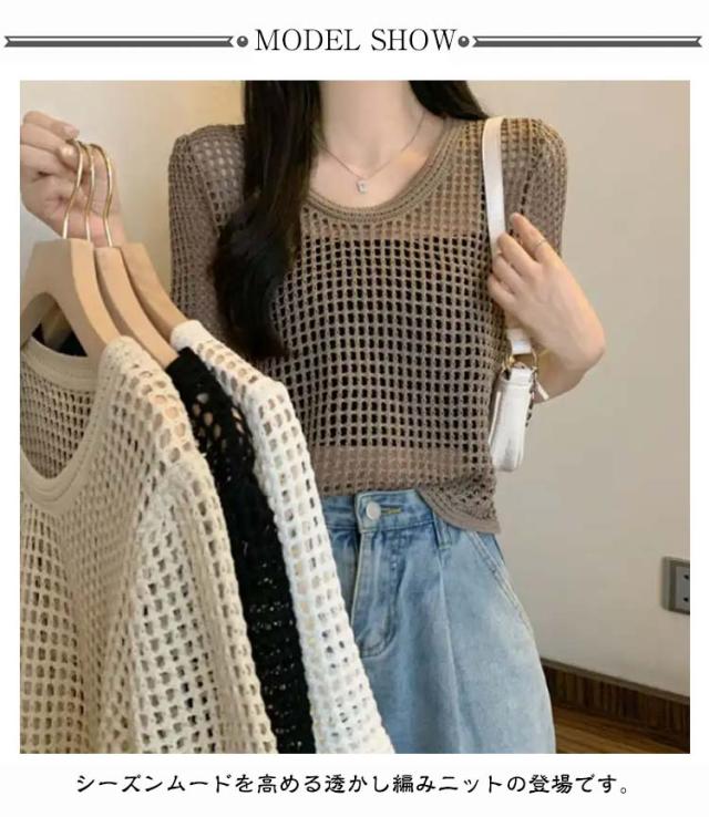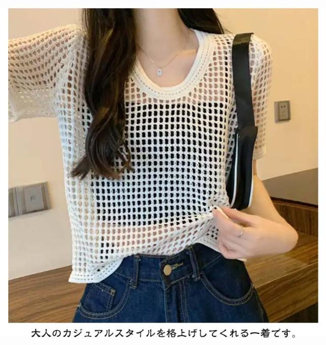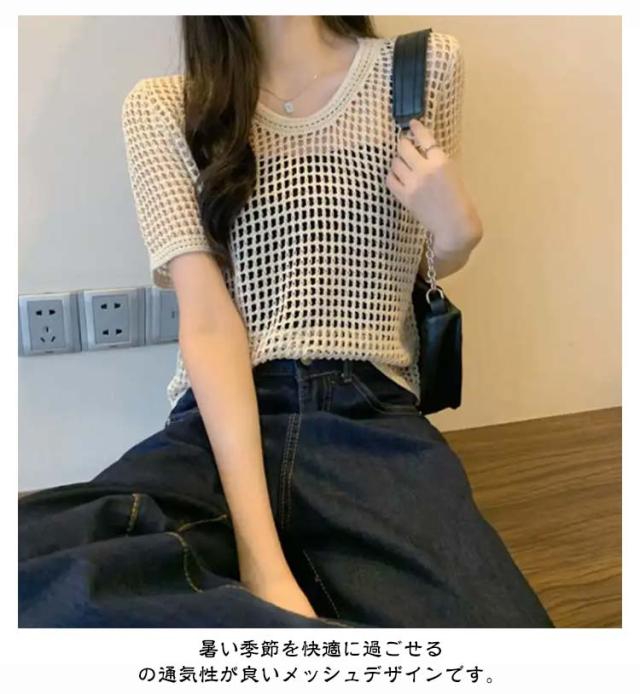 夏 【送料無料】サマーニット レディース メッシュ グルーネック お洒落 体型カバー 半袖 トップス プルオーバー シアーニット ニット 大人 透かし編みニット 薄手 透け感 大きいサイズ 無地 着痩せ きれいめ Tシャツ
