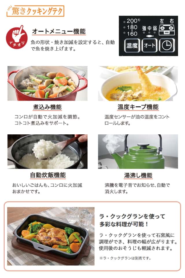 - 多彩な料理が可能でお手入れもラクなラ・クック(別売)に対応。