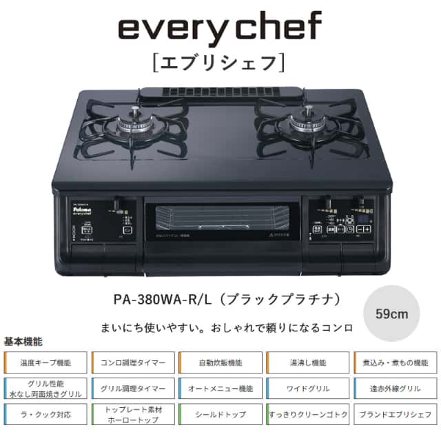 パロマ エブリシェフガステーブル ブラックプラチナ 59cm PA-380WA-R/L 都市ガス LPガス 右強火力 左強火力 テーブルコンロ ガスコンロ 日本製