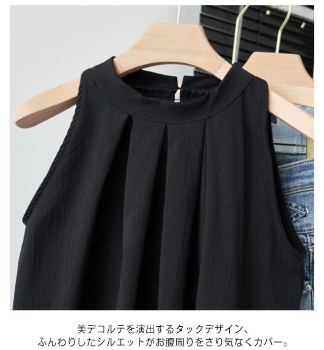 | キレイめにもカジュアルにも使えるノースリーブトップス。 美デコルテを演出するタックデザイン、ふんわりしたシルエットがお腹周りをさり気なくカバー。 女性らしい着こなしのアイテム、パンツにもスカートにも合わせやすい。 | |