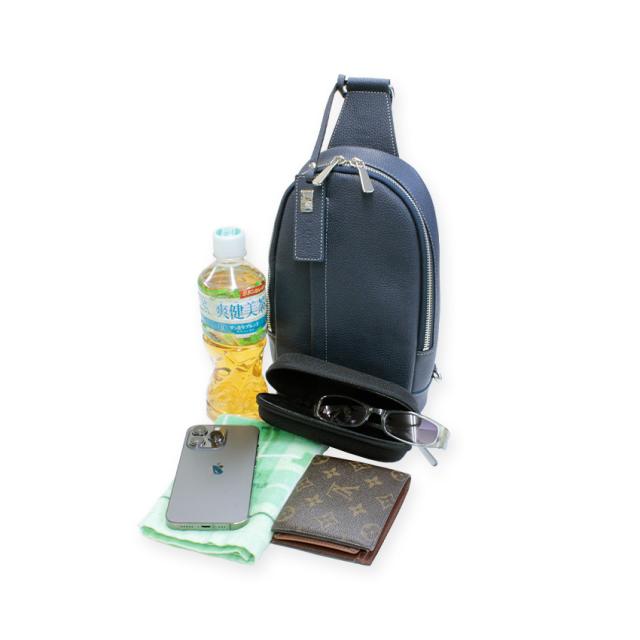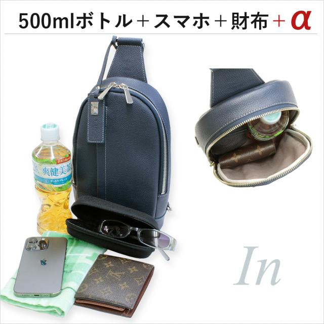 500mlのペットボトルや必需品をコンパクトに収納、且つ、すっきりと洗練されたスマートなデザインが魅力の本革ボディーバッグです。