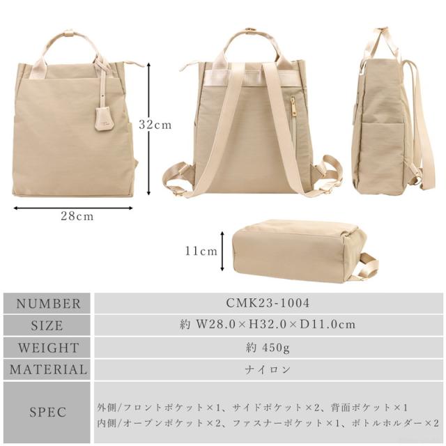商品カテゴリ:【ブラック】【黒】【グレー】【灰色】【アイボリー】【白】【生成】【グレージュ】トートリュック リュック 2way バッグ バックパック デイパック 手持ち 撥水 A4対応 ボトルホルダー キーチャーム付き 通勤 通学 CMK23-1004 送料無料 送料込み muumarju ムーマージュ