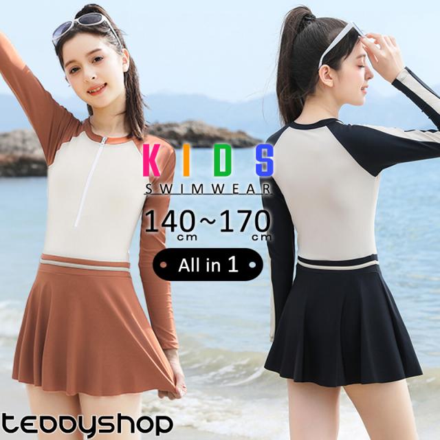 夏新作 キッズ 水着 女の子 ワンピース スクール水着 長袖 子ども 水陸両用 オールインワン 体型カバー 紫外線対策 パッド付き 入れ替え可 ハーフジップ バイカラー ラグランスリーブ 裏地あり 小学生 高学年 中学生 140 150 160 165 170 学校 授業 プール