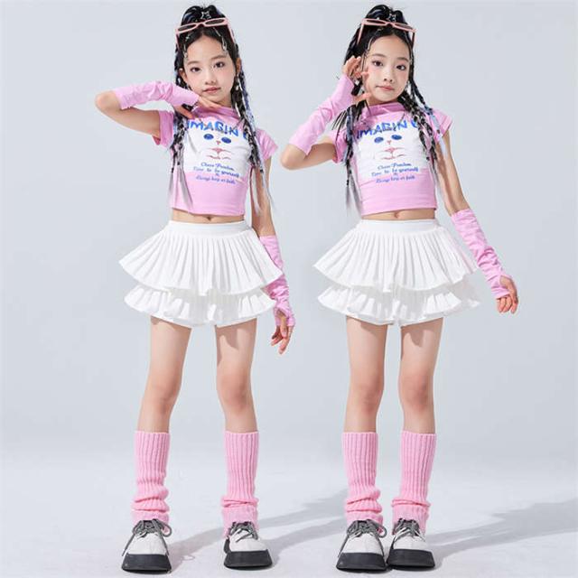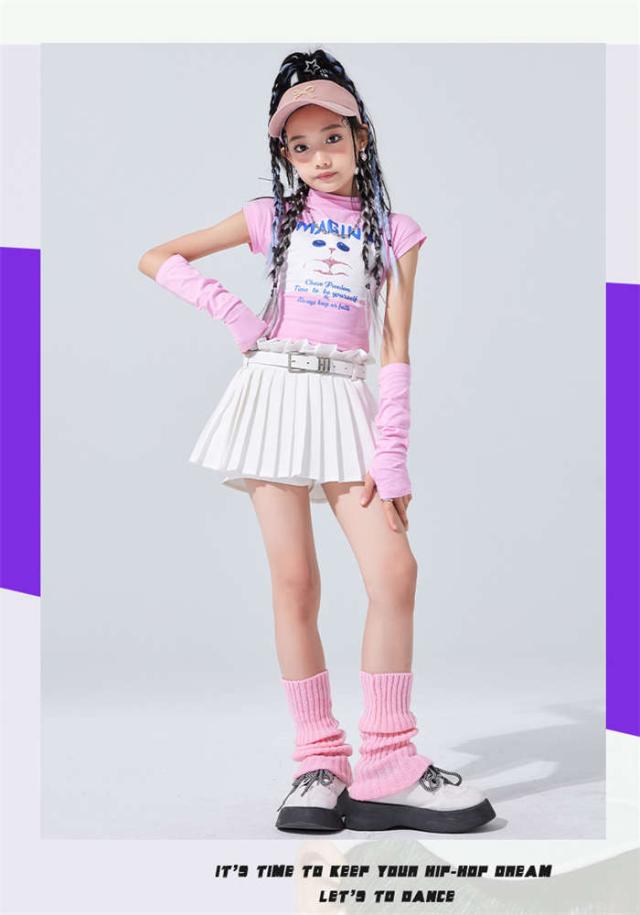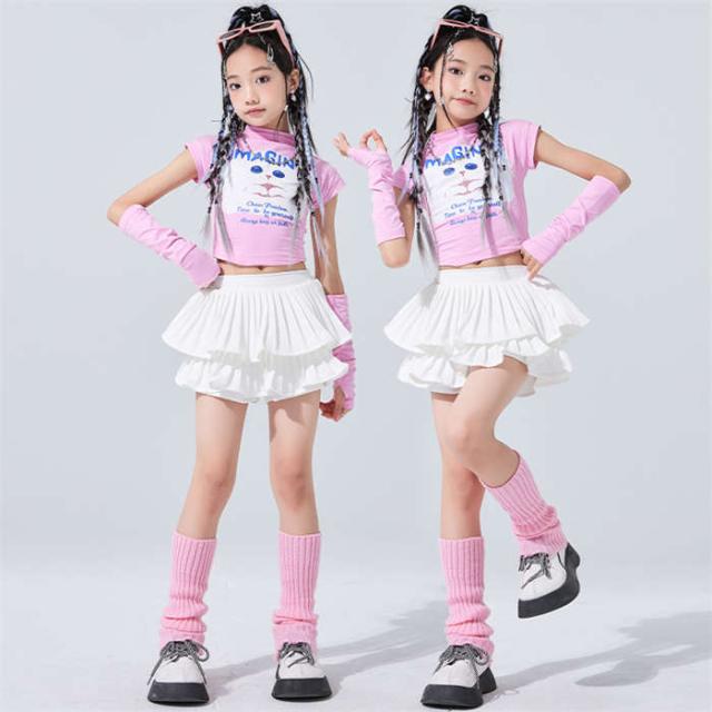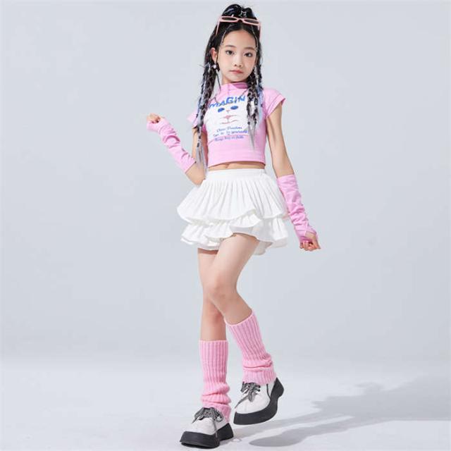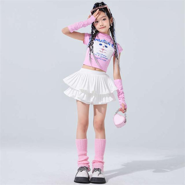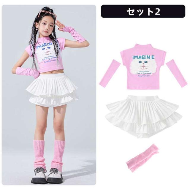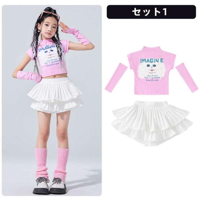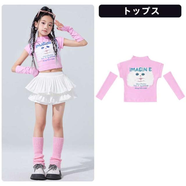 キッズ ダンス衣装 女の子 ダンス服 ダンスウェア チアガール ピンク ジャズダンス へそ出しねこ トップス スカートセットアップ ダンス着
