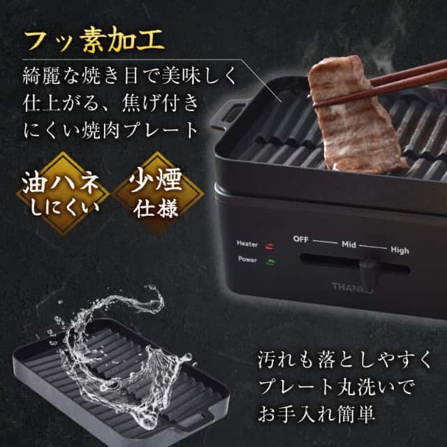 焦げ付きにいフッ素加工で、油ハネしにくく少煙。