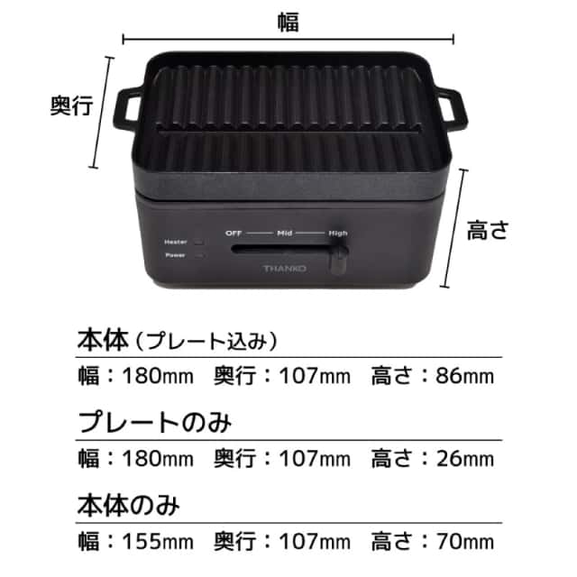 | 安全装置 | プレート未セット加熱防止スイッチ、温度ヒューズ、温度制御サーモスタット |