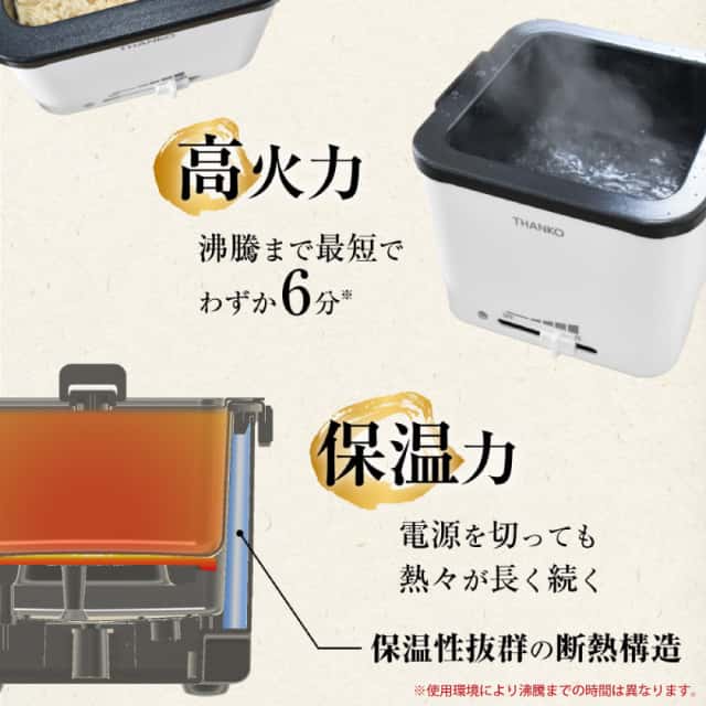 | 沸騰時間 | 500mlの常温水で約6分 ・環境温度により異なります |