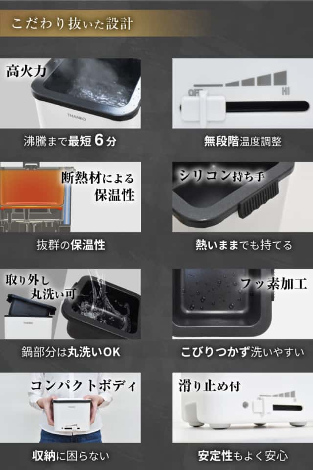 | 内容品 | 本体、鍋、蓋、シリコン持ち手×2、電源ケーブル、日本語説明書 |