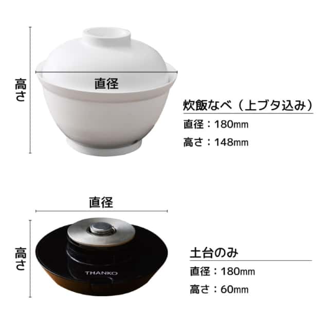 | サイズ | 炊飯なべ(上ブタ込み):直径180×高さ148(mm) 土台のみ:直径180×高さ60(mm) |