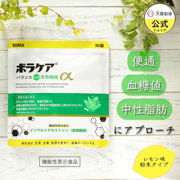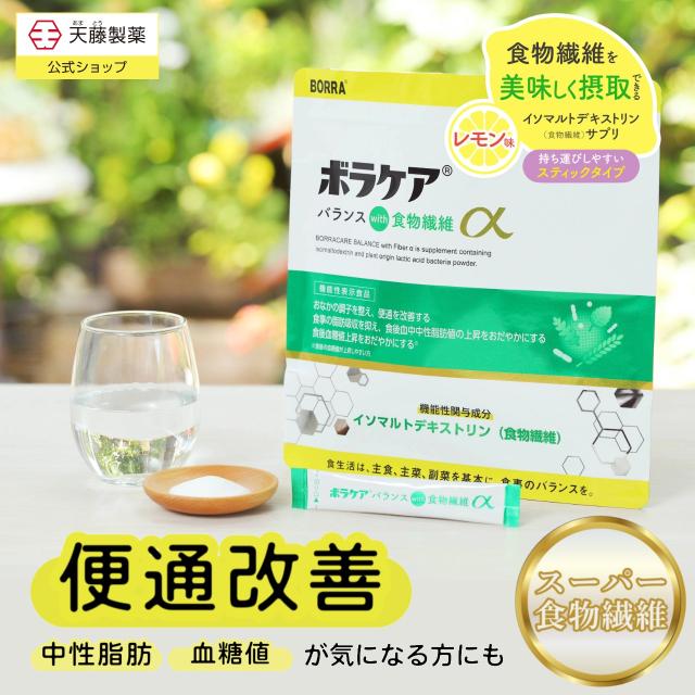 食物繊維 サプリ 便通改善 お通じ 便秘 腸活 デキストリン レモン味 中性脂肪 血糖値 粉末タイプ 水やお湯に溶かして飲む 血糖値上昇をおだやかに 食物繊維α ボラケア ボラギノールの会社 天藤製薬 機能性表示食品