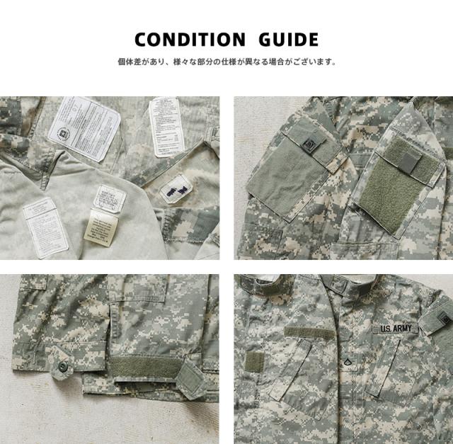 | 商品説明 | リジェクト 訳あり品 実物 USED 米軍 ACU コンバット ジャケット UCPのご紹介です。 制式名称:COAT, ARMY COMBAT UNIFORM 米陸軍の標準的な迷彩服として2004年から2019年まで採用された、UCP(Universal Camouflage Pattern)のデジタル迷彩が他にはない雰囲気を放つ、コンバットジャケットが入荷しました。 UCP迷彩はそれまでの流線型のパターンに対し、デジタル技術の数値データをもとに解析された機能的な「デジタルカモフラージュ」で、現代的な迷彩パターンとして今でも様々な国で広く採用されています。 米海兵隊で採用されていたMARPATのパターンを、様々な地形で目の印象に残らないように計算されたグレー基調にアップデート。ミニマルで都会的なグラフィックパターンは、現代のストリートの要素ともマッチするタウンウェアのデザインとして多くのブランドで取り入れられています。 ACUは「Army Combat Uniform」の略称で、BDU(Battle Dress Uniform)を踏襲したディテールに、斜めに配置された胸ポケットや立体的なデザインのユーティリティポケット、左袖にはペンホルダーも付属、肘部分にはエルボーパッドを入れて保護できるポケットなど機能性もアップグレード。ボタンが使用されていた部分には、ベルクロが採用されることで素早い着脱が可能になっています。 比翼仕立てのフロントはベルクロとジッパーで開閉、ベルクロ留めのスタンドカラーで、首元にはチンストラップも付属しています。袖のユーティリティポケットのフラップには、夜間の戦闘を考慮して付属する正方形の「IRタブ」という赤外線反射タブが装備され、暗視装置で視認した際に容易に敵味方を識別するためのパーツなどおもしろいディテールが満載です。 生地にはM-65パンツから続くコットンとナイロン混紡のリップストップ生地を使用しています。格子状に織り込まれた生地で、引き裂きに強く軽量。洗濯などで縮むこともなく、シワにもなりにくいタフな素材です。 優れた機能性に、取り入れるだけでワンランク上のコーディネートが楽しめる魅力的なデザイン。この先どんどん手に入りにくくなっていくアイテムです! こちらはUSED品の中からジッパー破損や、激しい色褪せや破れ汚れ、目立つリペアなど、全体的に不具合のある商品を選別しております。多少のリペアを施していただいてからの着用、もしくはリメイク資材としてもおすすめです。ファーストクオリティの品質を強くお求めの方は念の為ご購入をお控えくださいますようお願い致します。 | ||||||||||||||||||||||||||||||||||||||||||||||||||||||||||||||||||||||||||||||||