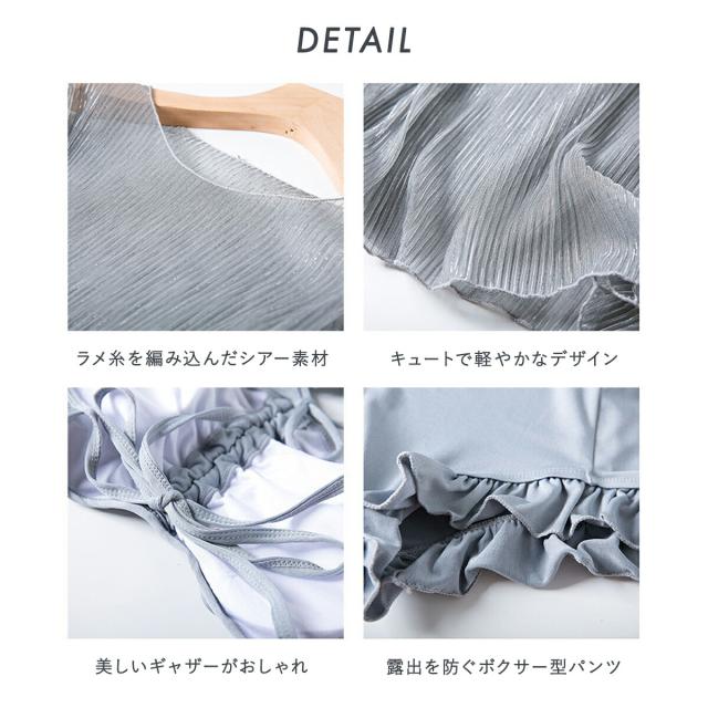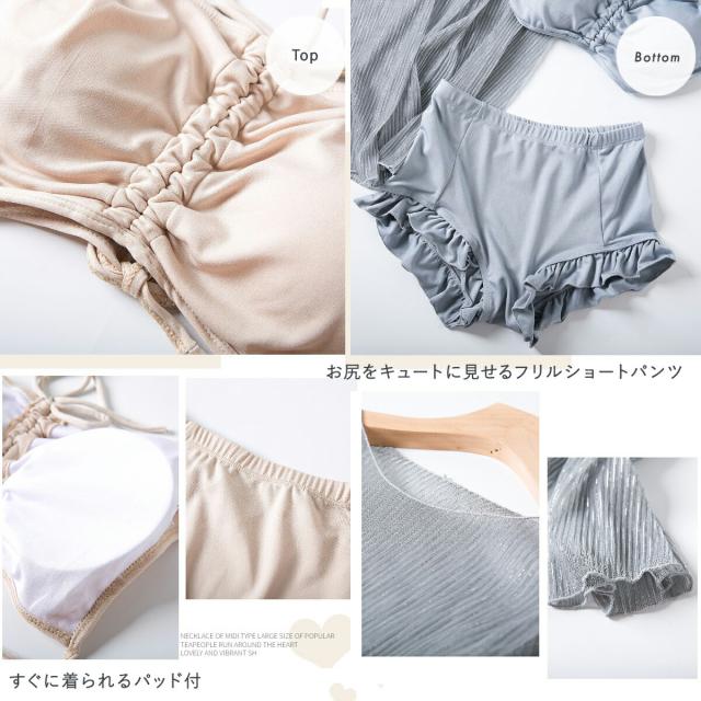 ボクサー型ショートパンツは控え目なフリルがおしゃれ。ビキニはすぐに着られるパット付き!