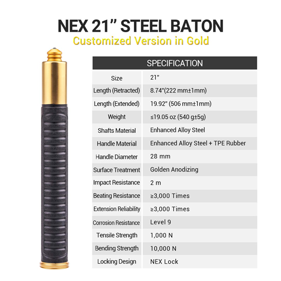 NEXTORCHのバトンには独自のロック機構(NexLock)が採用されています。殆どの中国メーカーがASPのTALONを真似てオートロックバトンを製作するのに対してNexLockは、他では見られないシンプルな構造でオートロックバトンを仕上げています。特許侵害に触れない為、欧米にも輸出が可能です。国際入札にもメジャーブランドと共に参加している数少ないオートロックバトンメーカーになります。とりわけ4140鋼を使用したスチールバトンは警棒の試験では最も難しいと言われるTR試験にも合格しています。そのため世界の軍事市場でも人気があるバトンです。近年ではルーマニアやドイツ軍にも納入された実績があります。