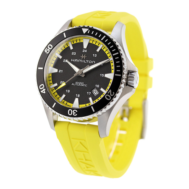 3年保証キャンペーン ハミルトン カーキ ネイビー スキューバ オート 40mm スイス製 メンズ レディース 腕時計 H82395332 HAMILTON KHAKI NAVY Scuba Auto アナログ ブラック イエロー 黒 ◆HAMILTON(ハミルトン)はアメリカ発祥の老舗ブランドです。創業翌年に誕生した懐中時計「ブロードウェイ・リミテッド」は、他の時計よりも正確に時を刻むことから鉄道用時計として採用されました。その後も航空用時計や軍用時計として採用されるなど、品質の高さと流行にながされない独自のデザインが世界中の人々に支持されています。 ビーチサイド、プールサイド、深海での遊泳。「カーキ ネイビー スキューバ」は、水中での使用を想定したスタイルを提案します。アシッドイエローのラバーストラップと、コントラストの効いたブラックダイヤルを備え、機能的で注目のモデルとなっています。 機械式腕時計