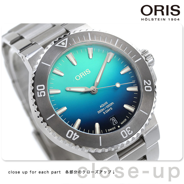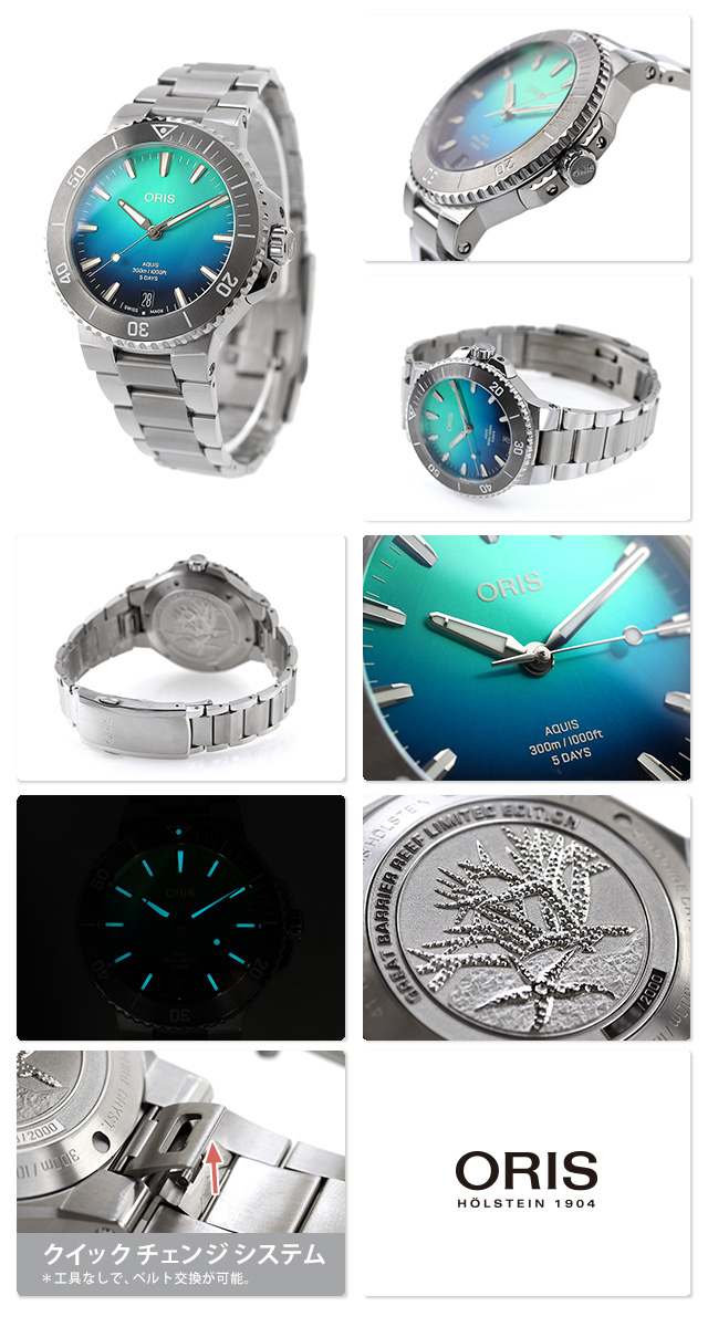 正規品 7年保証キャンペーン オリス グレートバリアリーフ リミテッドエディション IV 43.5mm 数量限定モデル スイス製 メンズ 腕時計 01 400 7790 4185-Set ORIS Great Barrier Reef Limited Edition IV アナログ ブルーグラデーション ◆ORIS(オリス)は、ポール・カッティン氏とジョージ・クリスチャン氏の2人によってスイスのヘルシュタインで創設されました。近くを流れる小川にちなんで社名をオリスと命名。手頃な価格ながら、革新的で高機能かつ実用的な機能を備えた本格機械式時計で知られ、世界中の時計ファンから愛されているブランドです。 アクイスデイトをベースにした2000本限定モデル。世界最大のサンゴ礁システムであるオーストラリアのグレート・バリア・リーフを支援するためのシリーズ第4弾です。鮮やかなグラデーションブルーの文字盤で、グレートバリアリーフを上空から見たときのターコイズブルーと、海にそそぐ太陽の光を表現しています。 発売日:2024年7月発売 機械式腕時計