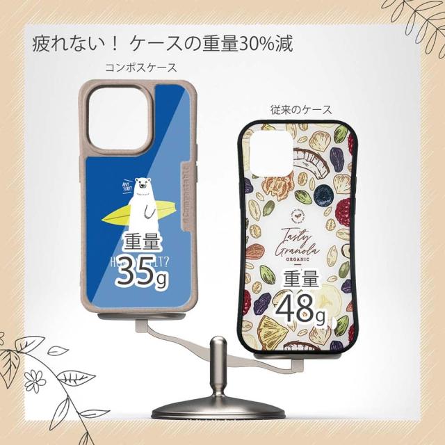 | 注意事項 | コンポスケースは、フレーム部分に「生分解性プラスチック」という環境に優しい素材を使用しております。そのため擦ったり、ぶつけたりする衝撃を与えると脆い部分もあります。耐衝撃ケースではないことをご了承ください。 Qi充電やMagSafe充電にも対応していますが、装着していない時に比べると充電速度は落ちます。 |