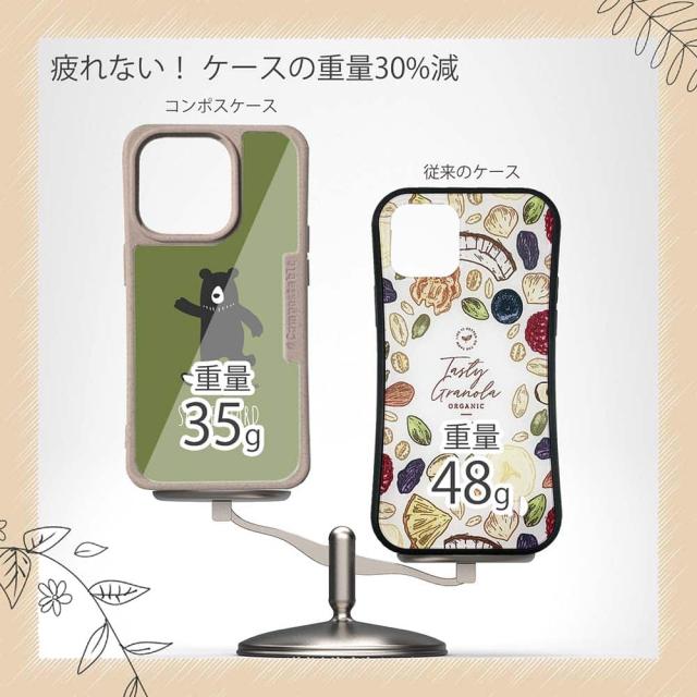 | ケースについて | 背面の内側に入れ込むデザインシートで、シーンに合わせて着せ替え可能。また、グリップしやすいクッション構造で、本体重量は約35gと軽減化を実現。さらに衝撃に強いSライン形状、究極に押しやすいボタン設計(切り込みが入ることで押し込む力を軽減)、背面のカメラ・レンズを保護する高さ設計となっております。生分解性プラスチック素材ながらも着脱もしやすく、割れない・指紋防止加工を施しています。 |