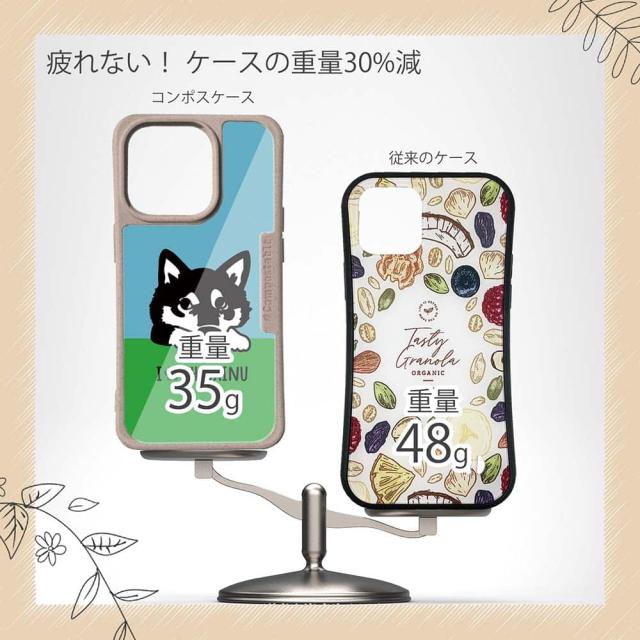 | ケースについて | 背面の内側に入れ込むデザインシートで、シーンに合わせて着せ替え可能。また、グリップしやすいクッション構造で、本体重量は約35gと軽減化を実現。さらに衝撃に強いSライン形状、究極に押しやすいボタン設計(切り込みが入ることで押し込む力を軽減)、背面のカメラ・レンズを保護する高さ設計となっております。生分解性プラスチック素材ながらも着脱もしやすく、割れない・指紋防止加工を施しています。 |