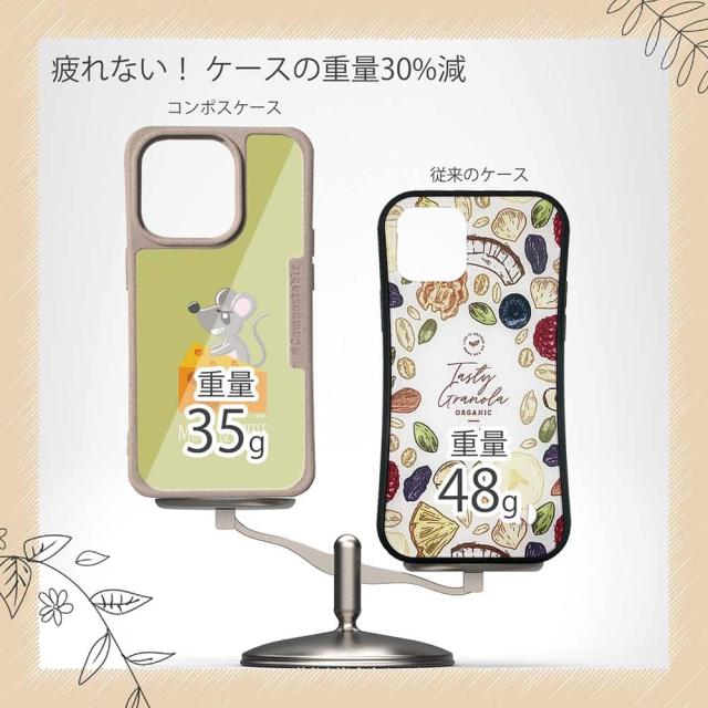 | 商品説明 | コンポスケースは、環境負荷低減を目的に開発されたスマホケース。従来のスマホケースと比べ、CO2排出量を50%削減できます。しかも、循環型社会に対応した素材を使ったケースです。 フレームカラーが4色からお選び頂けます。※コンポスケースとデザインシートが1つずつのセット商品となります。商品画像の15枚目と16枚目は、スマホの背景色によるサンプルです。ケース自体の背面は透明なので、スマホの背面色によってこのような色になるという例です。背景の色が選べる訳ではありませんので、予めご了承下さいませ。 チーズ大好きのネズミくん。とっても美味しそうなチーズをゲットして何やら誇らしげな様子。 デザイナー/wakat ![]() |