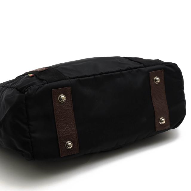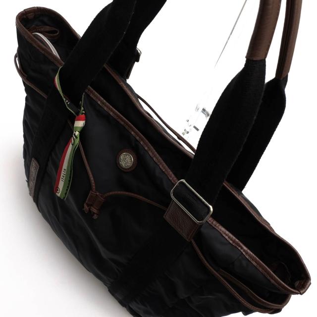 オンオフ兼用で使える大人っぽく上品なトートバッグ。丈夫で光沢のあるリモンタナイロンと牛革のコンビネーションが、高級感を演出。ジップ開閉のメインルームにはA4サイズ対応のバックル式ポケットがあり、外側にはさっと手に取れるポケットを複数装備。ハンドルの長さは調節可能で、どんなスタイルにも対応できます。また、底面には鋲で補強が施され、耐久性もバッチリ。カジュアルからビジネスシーンまでマッチし、一泊程度の旅行にも対応できる容量も魅力です。