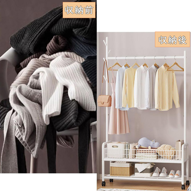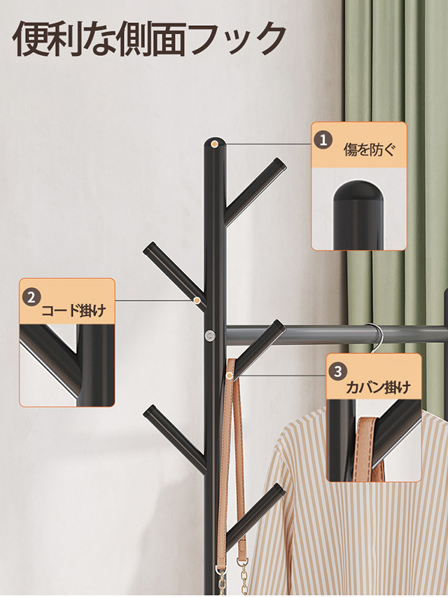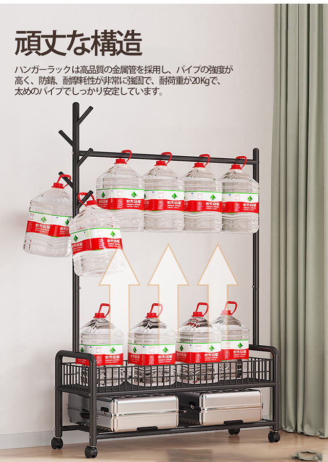 【多機能収納】多機能のハンガーラックはコートや洋服などをかける、帽子やカバンなどをかける、さらには収納ケース、靴、カバン、タオル、布団や小物を置くことも可能です。下部にある棚には靴やスーツケースも置けます。大幅にあなたの狭い部屋にスペースを省けます!