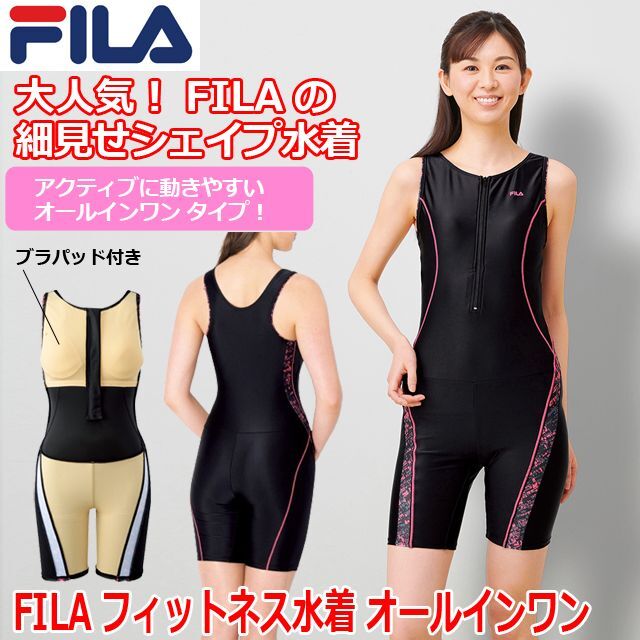 レディース スイムウェア フィラ(FILAフィットネス水着 オールインワン)細見せシェイプ水着 袖なし 体型カバー ブラパッド付き フロントジッパー 敬老の日 プレゼント