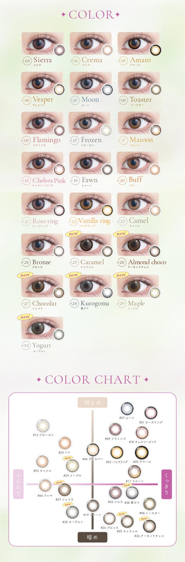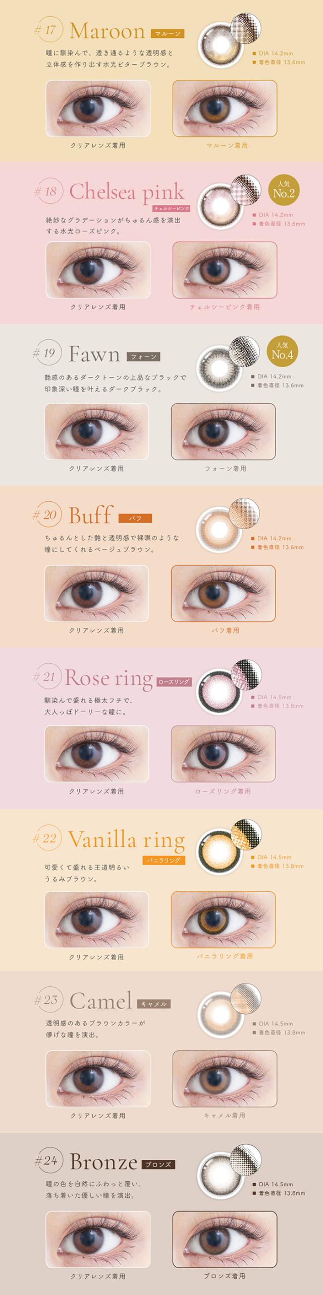 | 着色直径 | 13.6mm:マルーン/チェルシーピンク/ファン/バフ 13.7mm:シエラ/クレマ/アマーロ/ヴェスパー/ムーン/トースター/フラミンゴ/フローズン 13.8mm:キャラメル/アーモンドチョコ/ショコラ/黒ゴマ/メープル/ヨーグルト/ローズリング/バニラリング/キャメル/ブロンズ |