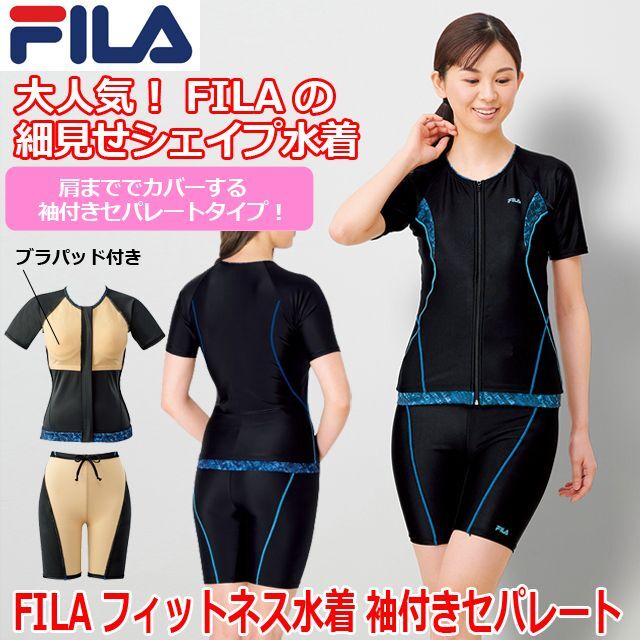 レディース スイムウェア フィラ(FILAフィットネス水着 袖付きセパレート) 細見せシェイプ水着 半袖 体型カバー ブラパッド付き フロントジッパー プレゼント