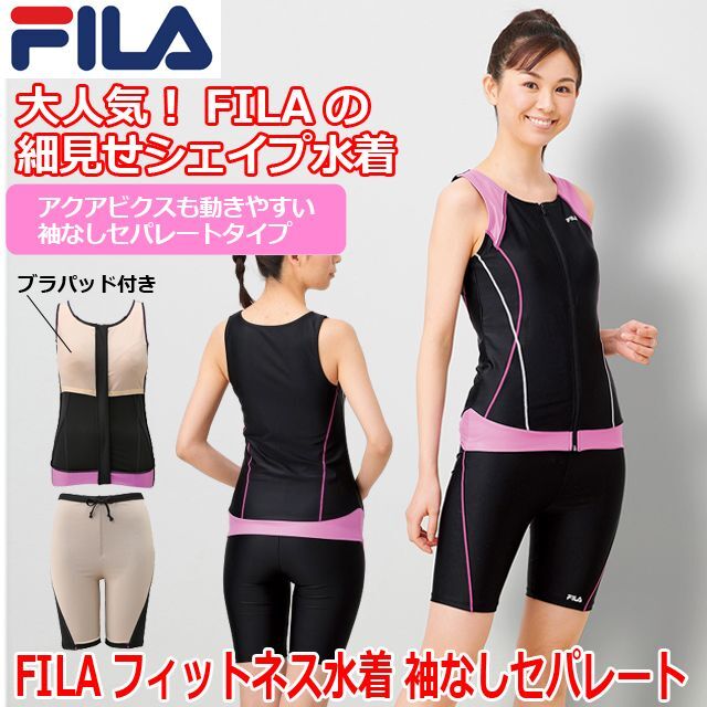 レディース スイムウェア フィラ(FILAフィットネス水着 袖なしセパレート) 細見せシェイプ水着 袖無し 体型カバー ブラパッド付き フロントジッパー 敬老の日 プレゼント