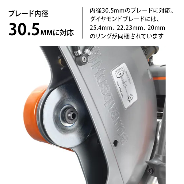 内径30.5mmのブレードに対応しています。ハスクバーナダイヤモンドブレードには、25.4mm、22.23mm、20mmのリングが同梱されています