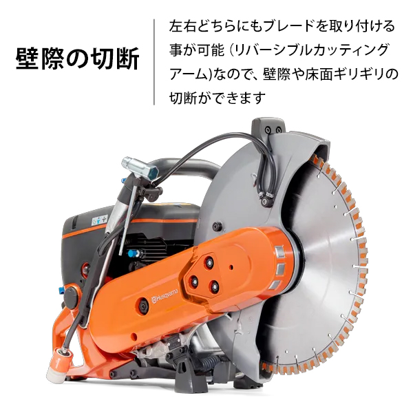 左右どちらにもブレードを取り付ける事が可能(リバーシブルカッティングアーム)なので、壁際や床面ギリギリの切断ができます
