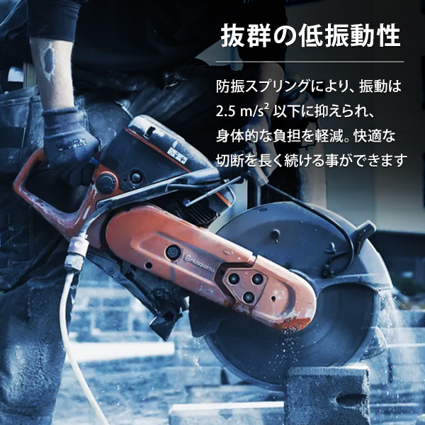 防振スプリングにより、振動は2.5 m/s? 以下に抑えられ、身体的な負担を軽減。快適な切断を長く続ける事ができます