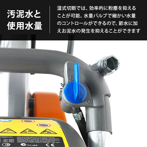 湿式切断では、効率的に粉塵を抑えることが可能です。水量バルブで細かい水量のコントロールができるので、節水に加えお泥水の発生を抑えることが可能