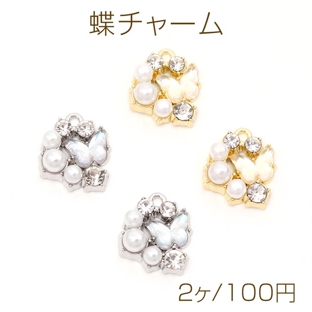 蝶チャーム 樹脂チャーム メタルチャーム パールとラインストーン付き 1カン付き オーロラカラー 約15×18mm(2ヶ)