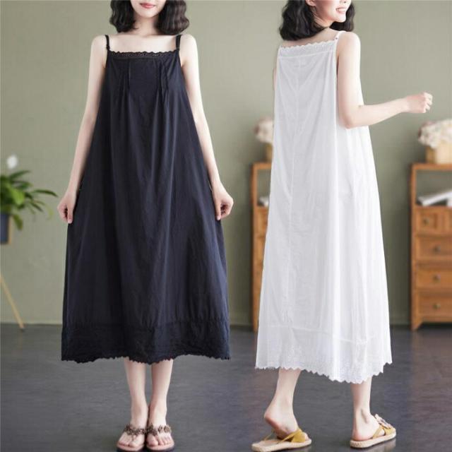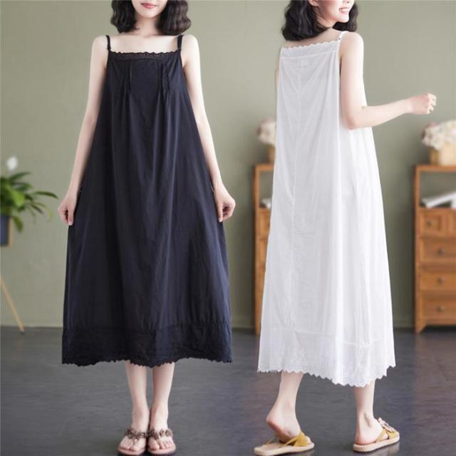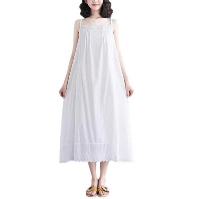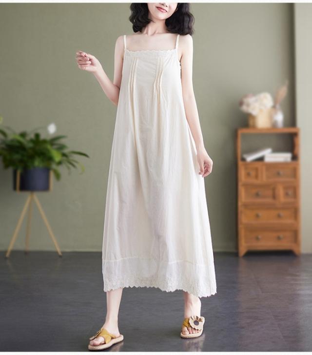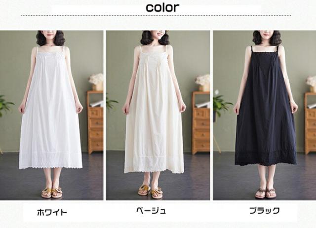 ぺチワンピース レース 綿 キャミソール ワンピース ロング丈 インナー コットン ノースリーブ ギャザー ピンタック キャミワンピース ボートネック aライン キャミワンピ