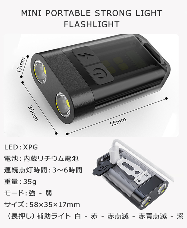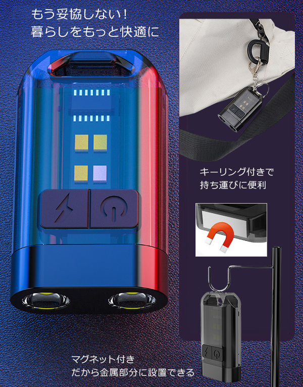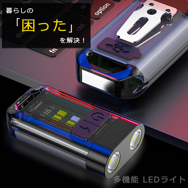 暗い場所でも自由自在!もう暗闇で手探りしなくていい!多機能LEDライト \多機能LEDライトのここがスゴイ!/ 多機能性: 懐中電灯、作業灯、読書灯など、これ1つで様々なシーンに対応。 コンパクトサイズ: 全長58mmと非常にコンパクトで、持ち運びに便利です。キーリングも付属。 マグネット搭載: 本体底部にマグネットが搭載。金属面などに固定してハンズフリーで使用できる。 9種の点灯モード: トップLEDとサイドLEDそれぞれに様々な点灯モードがあり、シーンに合わせて光の色や強さを調整できる。 USB Type-C充電式: USB Type-Cケーブルで簡単に充電でき、繰り返し使用可能。 あらゆるシーンで快適な照明環境を手に入れることができますね! 1: 暗い場所での作業や探し物を快適に! もう暗い場所での作業や探し物にイライラする必要はありません! この多機能LEDライトがあれば、どんな場所でも瞬時に明るく照らし、作業効率を大幅に向上させることができます。 2: 暮らしの「困った」を解決!これ1つでマルチに活躍 Before: 暗闇で鍵穴が見えず、家に入るのに手間取っていた日々。 キャンプでテントの中が暗く、不便を感じていた夜。 After: このLEDライトがあれば、もうそんな悩みとは無縁!強力な光で鍵穴を明るく照らし、 スムーズに家に入れます。テント内も明るく照らし、快適なキャンプを楽しめます。 3. ストレスフリーな毎日を、この一台で! ■「電池がない!」 → USB Type-Cで繰り返し充電可能だから、もう電池切れの心配なし! ■「ライトが大きくて邪魔…」 → コンパクトサイズ&クリップ付きで、いつでもどこでも持ち運びラクラク! ■「ライトの光が強すぎて眩しい…」 → 9種の点灯モードで、シーンに合わせて明るさ調整可能! 4: もう不安を感じない!頼れる相棒 停電時: 突然の停電でも、このライトがあれば安心。 災害時: 避難時や救助を求める際にも役立ちます。 防犯対策: 暗い夜道を歩く際、あなたの安全を守ります。 5: もう妥協しない!暮らしをもっと快適に 暗いから諦めていた夜のお散歩、手元が見えづらかった細かい作業…もう我慢する必要はありません! このLEDライトがあれば、あなたの行動範囲が広がり、やりたいことをもっと自由に楽しめます。 【商品詳細】 サイズ(約):58×35×17mm 重量(約):35g 点灯時間:約3-6時間 バッテリー容量:200mA 付属品:USB Type-Cケーブル 生産国:中国 【商品特徴・キーワード】 多機能LEDライト USB充電式 小型LEDライト 懐中電灯 LED 作業灯 LED マグネット付きLEDライト クリップ付きLEDライト 9モードLEDライト Type-C充電式LEDライト コンパクトLEDライト アウトドアLEDライト キャンプ用LEDライト 車用LEDライト 読書用LEDライト DIY用LEDライト キーホルダー型LEDライト |