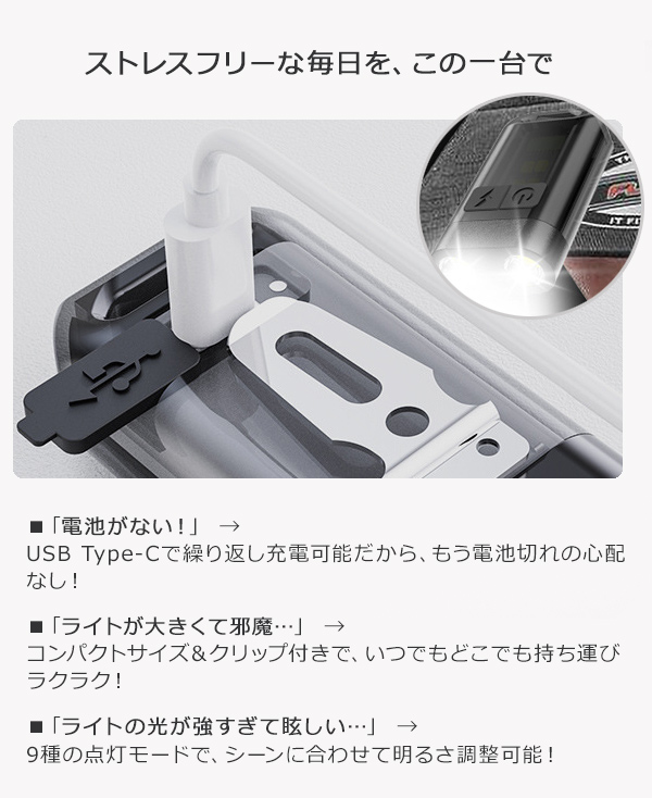 USB Type-Cケーブルで簡単に充電でき、繰り返し使用可能。