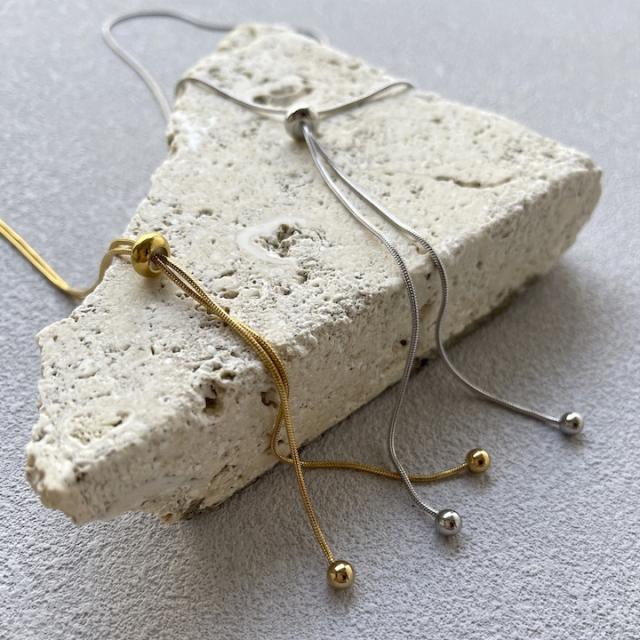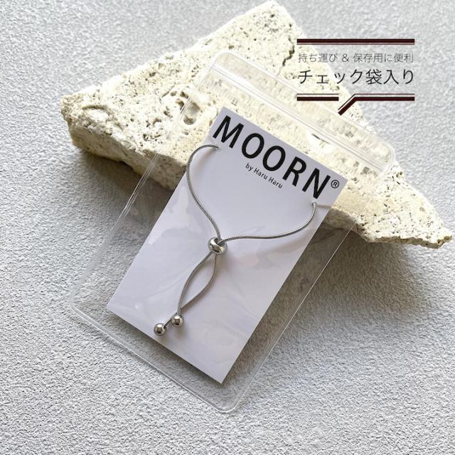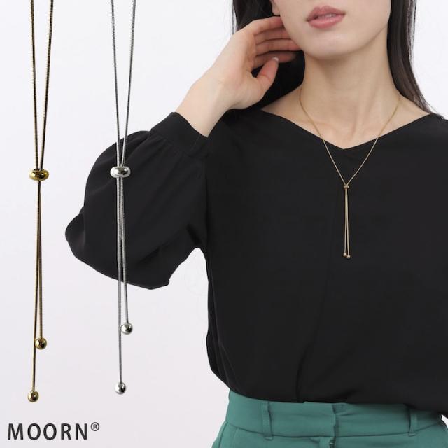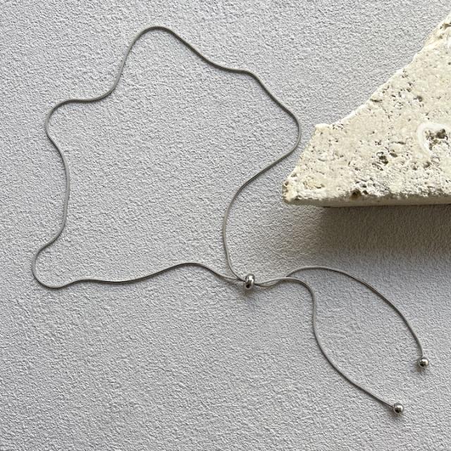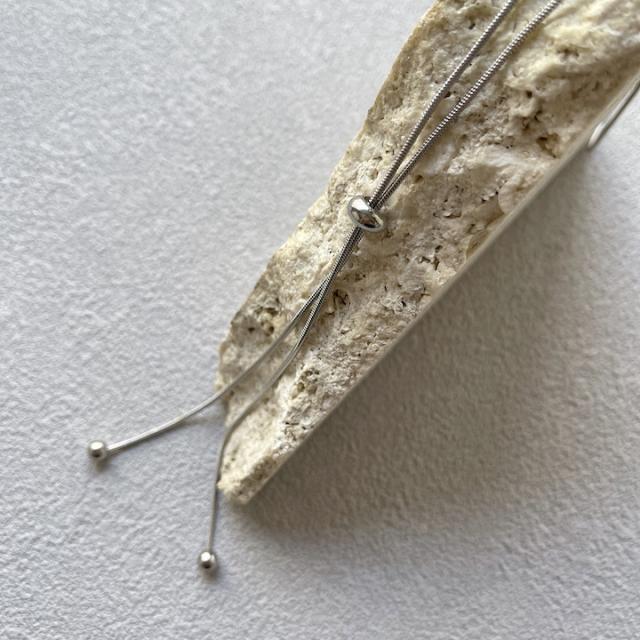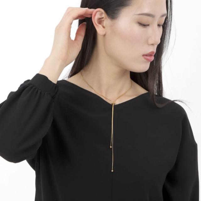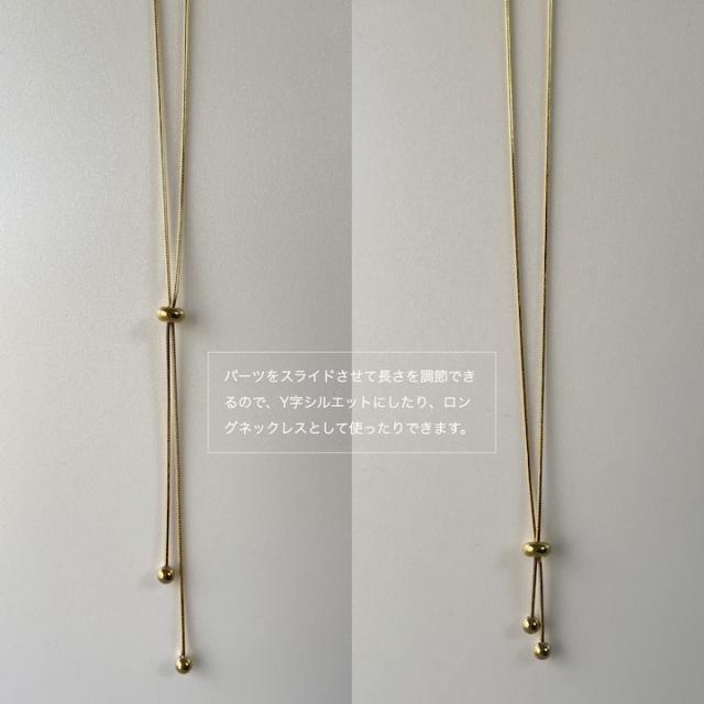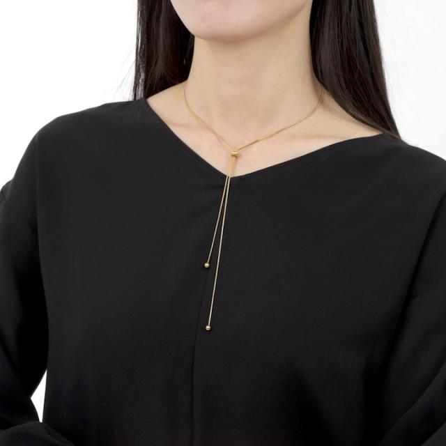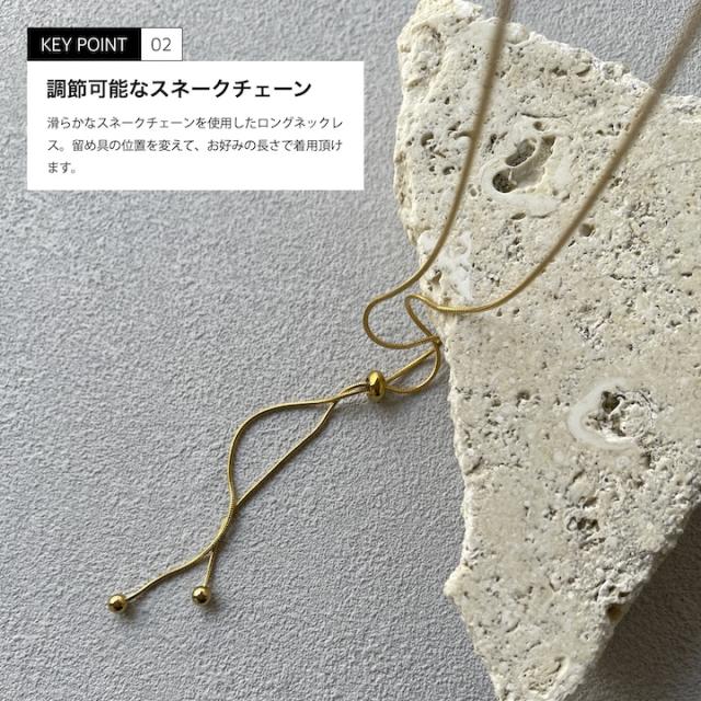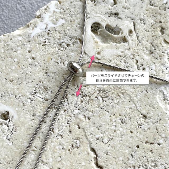 スネークチェーンを使用したロングネックレス。留め具の位置を変えてお好みの長さで着用頂けます。