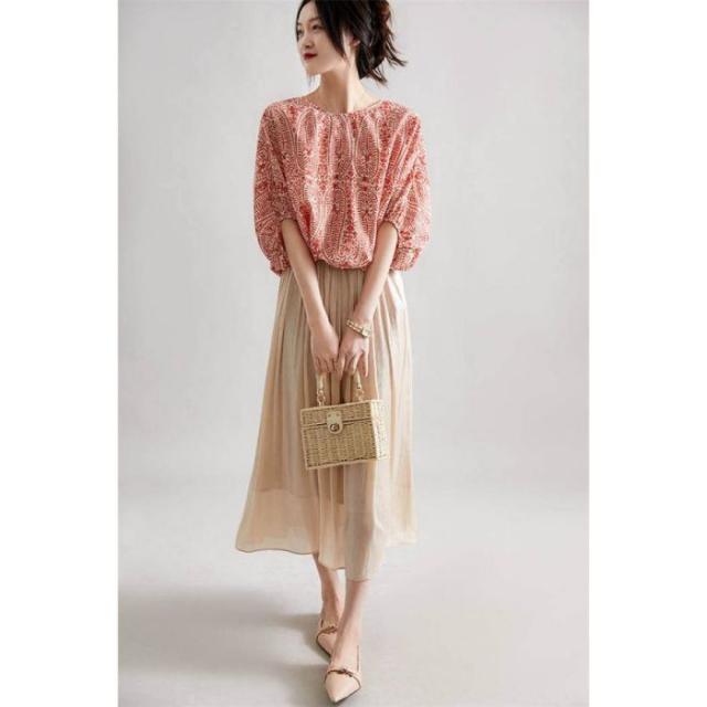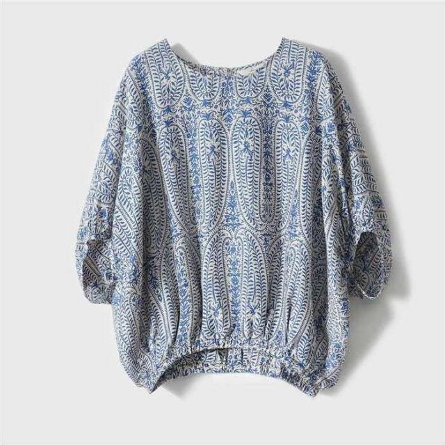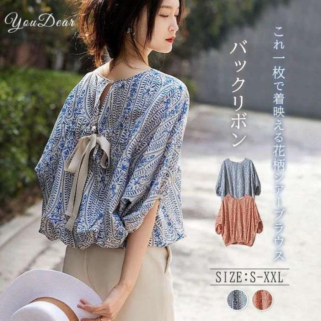 連携キーワード:ブラウス プルオーバー パフスリーブ ぽわん袖 バックリボン 後ろリボン 七分袖 ショート丈 ギャザー 花 フラワー 花柄 ボタニカル柄 シースルー シアー レイヤード 重ね着 おうちで洗える 薄手 涼しい 春夏秋 女子会 カジュアル お出掛け 大人女子 可愛い 上品 きれいめ レトロ シンプル ナチュラル