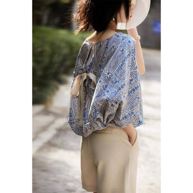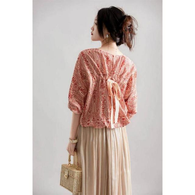 ブラウス レディース トップス 七分袖 バックリボン 後ろリボン きれいめ ギャザー パフ袖 薄手 レトロ 大きいサイズ 体型カバー 着やせ ゆったり Tシャツ