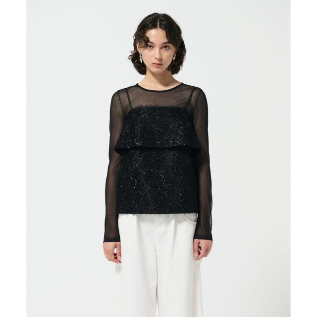 華やかにレイヤードを楽しむキャミソールトップス。ふわっとしたラメ入りの細かなシャギー素材にフリルを重ねた、主役級の存在感を放つデザインです。華奢なストラップがフェミニンなムードを高めつつ、シックなカラー展開で大人っぽく合わせていただける一枚に仕上げました。シアートップスの上に添えたり、そのまま一枚でヘルシーな着こなしを楽しんだりと、様々な着回しをお楽しみください。