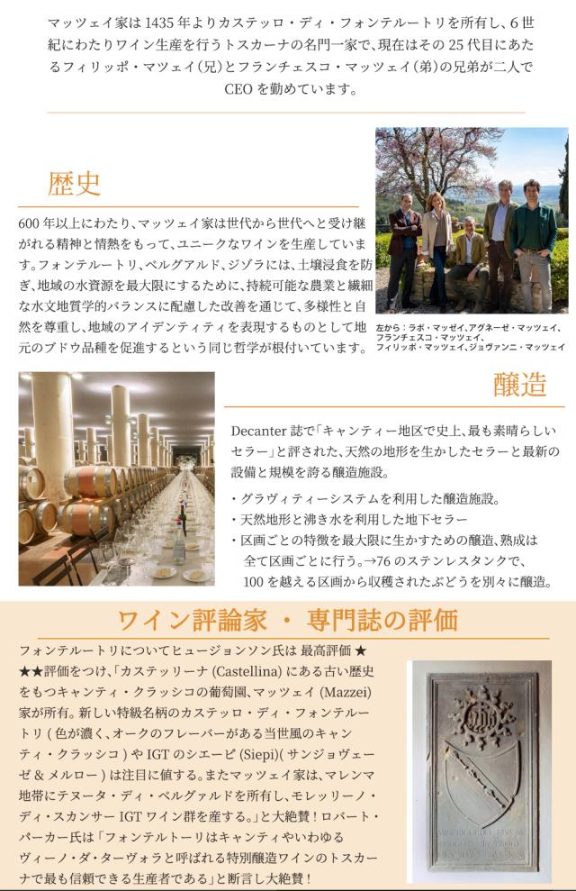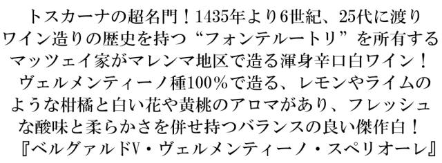 トスカーナの超名門!1435年より6世紀、25代に渡り ワイン造りの歴史を持つ“フォンテルートリ”を所有する マッツェイ家がマレンマ地区で造る渾身辛口白ワイン! ヴェルメンティーノ種100%で造る、レモンやライムの ような柑橘と白い花や黄桃のアロマがあり、フレッシュ な酸味と柔らかさを併せ持つバランスの良い傑作白! 『ベルグァルドV・ヴェルメンティーノ・スペリオーレ』