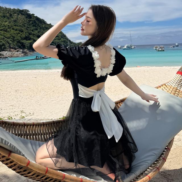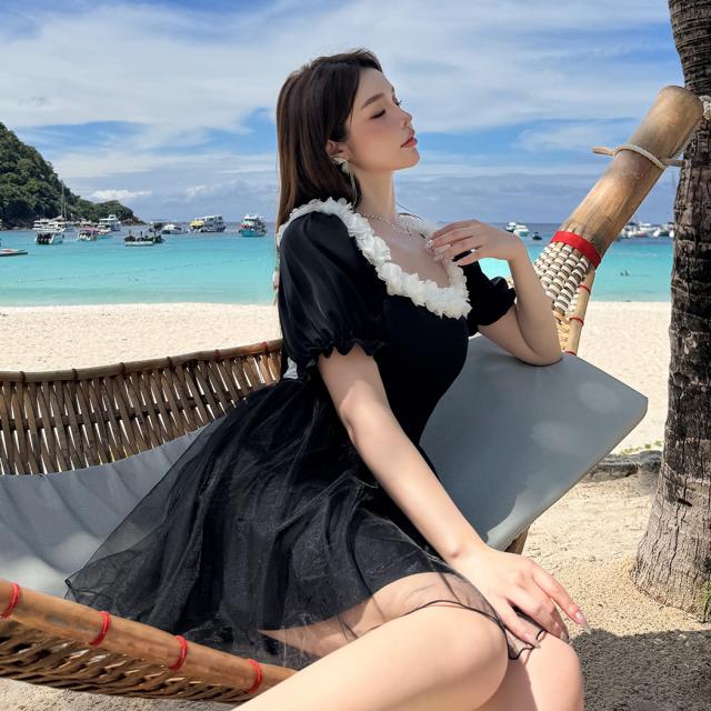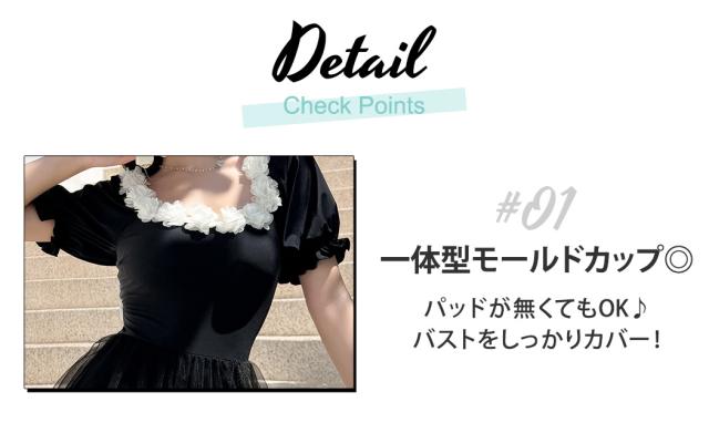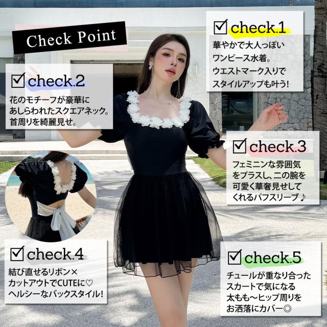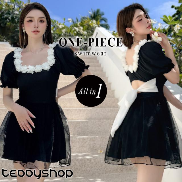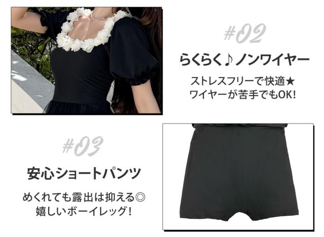 夏新作 水着 ワンピース 半袖 体型カバー水着 レディース オールインワン パフスリーブ Aライン 服見え フラワーモチーフ スクエアネック 2重 チュールスカート バックリボン カットアウト モールドカップ 二の腕 ウエスト お腹 ヒップ 太もも カバーアップ 黒 白 海