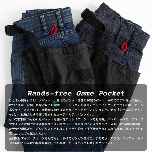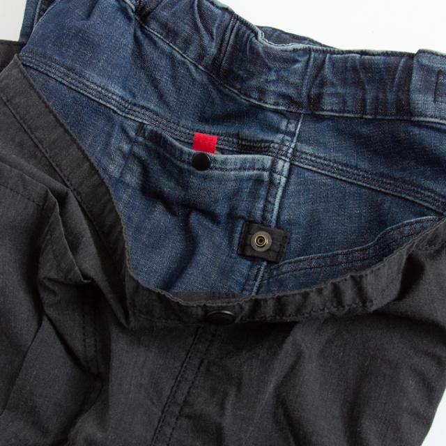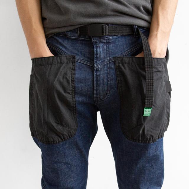 「ハンズフリーポケット」部分にNANGAオリジナル素材「HINOC/ヒノック」を採用。難燃性に優れ、かつ丈夫な素材で収容力抜群。内股に配したガゼットクロッチで広範囲な可動域を確保し、全体的に窮屈感なく着用することが出来ます。また、後ろ中心にシームを追加し食い込みを緩和し、ヒップ回りのフィットがスッキリはきやすくなりました。左ポケットにはデイジーチェーンを配置。また、「NANGA」ロゴ入りのカラビナテープもついていますので、デイジーチェーンにはアウトドアギアやハンドタオルを、カラビナループにはカギやカップなど、使用方法はアイデア次第で無限大。 |