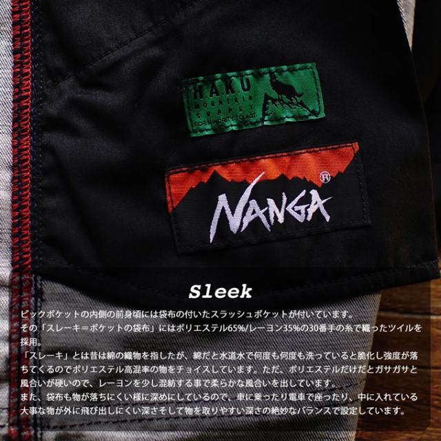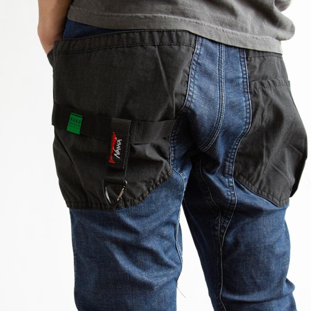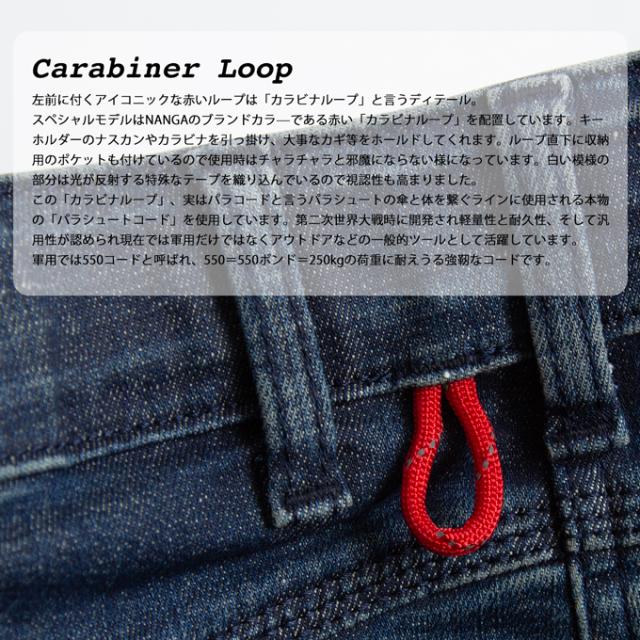 「ハンズフリーポケット」部分にNANGAオリジナル素材「HINOC/ヒノック」を採用。難燃性に優れ、かつ丈夫な素材で収容力抜群。内股に配したガゼットクロッチで広範囲な可動域を確保し、全体的に窮屈感なく着用することが出来ます。また、後ろ中心にシームを追加し食い込みを緩和し、ヒップ回りのフィットがスッキリはきやすくなりました。左ポケットにはデイジーチェーンを配置。また、「NANGA」ロゴ入りのカラビナテープもついていますので、デイジーチェーンにはアウトドアギアやハンドタオルを、カラビナループにはカギやカップなど、使用方法はアイデア次第で無限大。