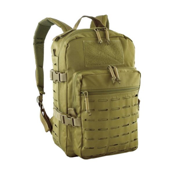 ●レーザーカットのMOLLEシステムが前面と側面に施されており、別売りのポーチなどを取り付け可能です。