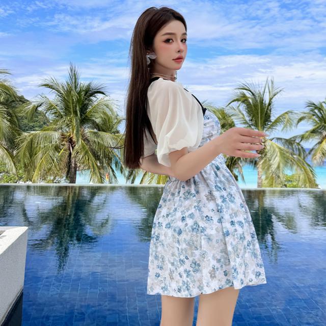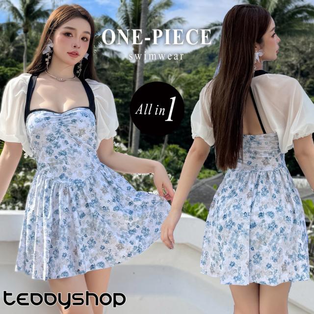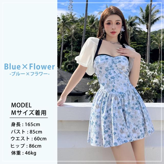 水着 ワンピース 体型カバー レディース オールインワン Aライン フレア 半袖 花柄 ギャザー パフスリーブ ミニ 袖あり シアー 袖口ゴム 背中 カットアウト ノンワイヤー ウエスト切り替え パッド付き 二の腕 ウエスト ママ