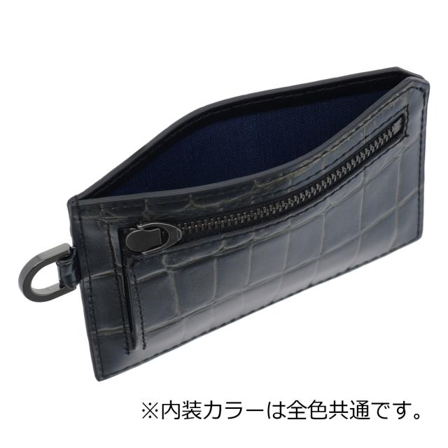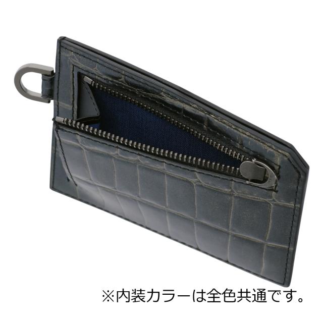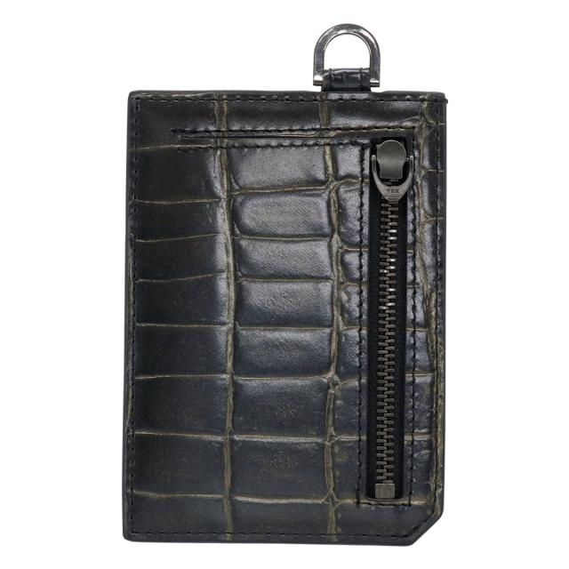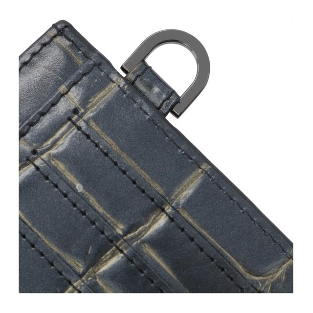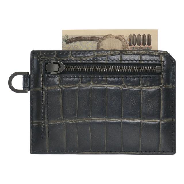 ブラックのクロコエンボスレザーをベースとして、その鱗模様の谷部分にはゴールドが輝く美しい仕上がり。熟練職人の手で行われるゴールドカラーの拭き取り加工により全体的に艶のある仕上がりとなった、重厚感かつ高級感あるアイテムシリーズです。一見パスケースにも見えるスリムでミニマルなフラット財布は、ジャケットの胸ポケットにも入れておけるコンパクトなサイズ。スマホとカードが1枚、もしもの時のためにお札が1枚あれば良い、というキャッシュレス派の方に最適なミニマルアイテムです。ミニバッグ用のセカンド財布やプレゼントにもおすすめです。